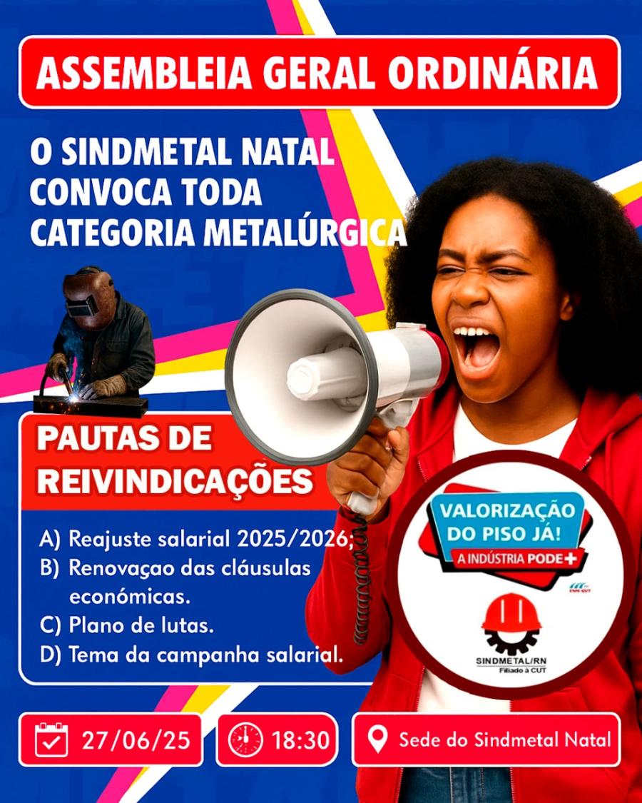 O Sindimetal Natal convoca todos os trabalhadores e trabalhadoras metalúrgicos para participarem da Assembleia Geral Extraordinária, onde será debatida a pauta de reivindicações da campanha salarial 2025/2026.
